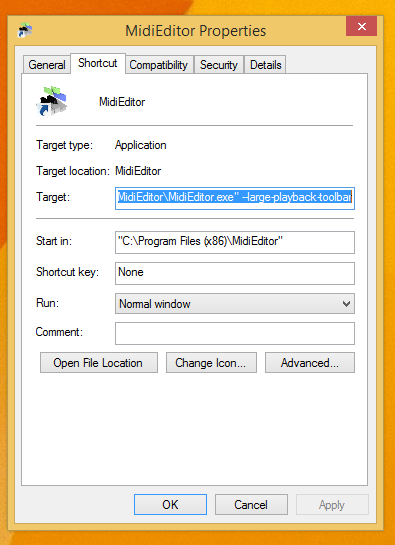 MidiEditor allows you to start with a larger playback toolbar. This is necessary when using the editor while beeing seated at your digital piano. The editor has to be started along with the command-line argument --large-playback-toolbar. On linux, use the command line to start MidiEditor. On windows, right-click on the desktop-shortcut and select "Properties". Add the argument --large-playback-toolbar to the target field as shown below.