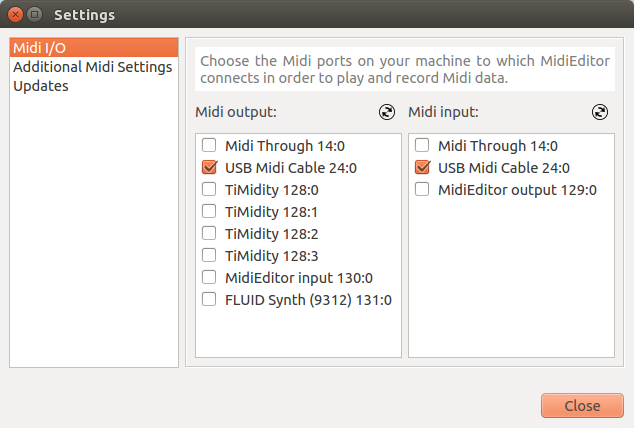To select the input or output device click "Settings.." in the MIDI menu in the menubar. In the list on the left-hand side of the upcoming dialog, please select the card "Midi I/O". This will show two lists which show all available input/output devices.