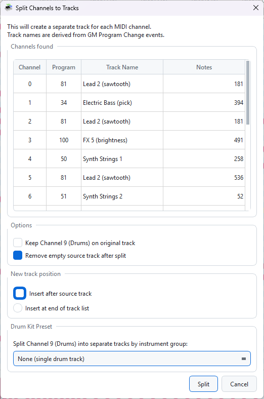| Keep Channel 9 (Drums) on original track | Unchecked | When checked, drum events stay on the source track instead of getting their own track. Useful if you want to keep drums with meta events. |