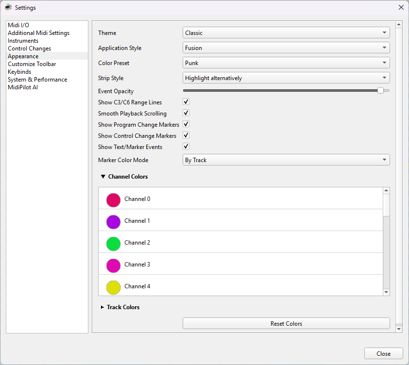 In the same Appearance panel you can choose from 10 color presets that instantly restyle the channel and track colors in the piano roll. The selected preset is remembered across sessions.